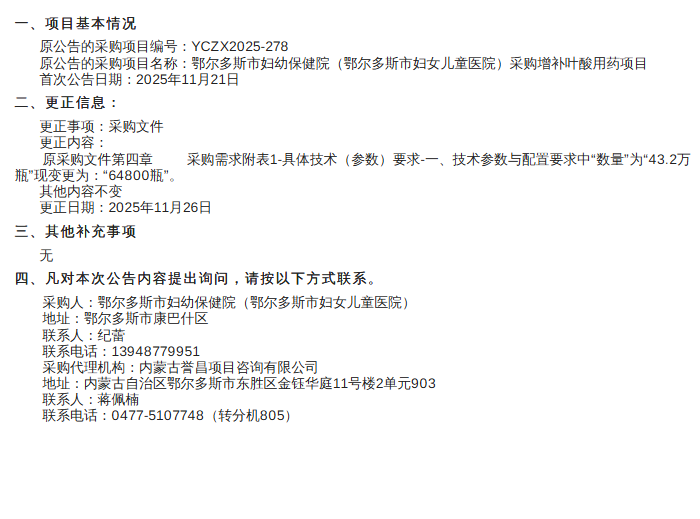 【鄂尔多斯市妇幼保健院】内蒙古自治区鄂尔多斯市妇幼保健院(鄂尔多斯市妇女儿童医院)采购增补叶酸用药项目更正公告(第一次)