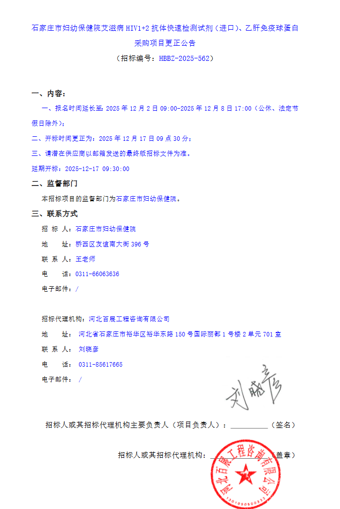 【石家庄市妇幼保健院】河北省石家庄市妇幼保健院艾滋病HIV1+2抗体快速检测试剂(进口),乙肝免疫球蛋白采购项目更正公告