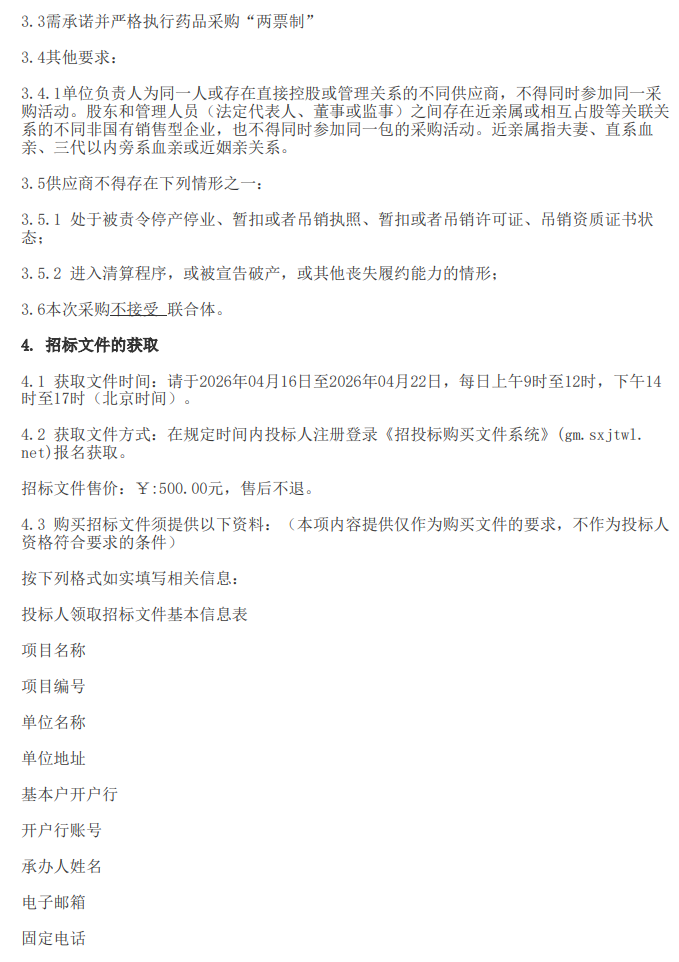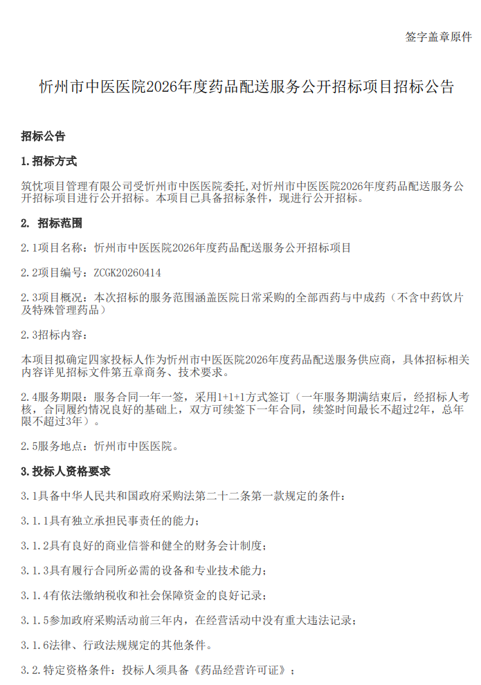 【忻州市中医医院】山西省忻州市中医医院2026年度药品配送服务公开招标项目招标公告
