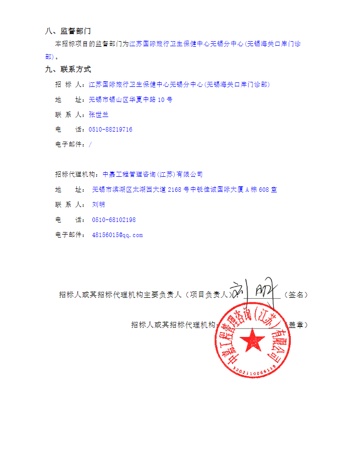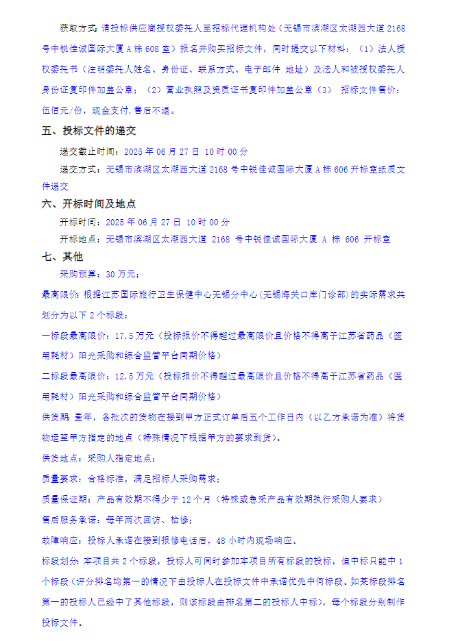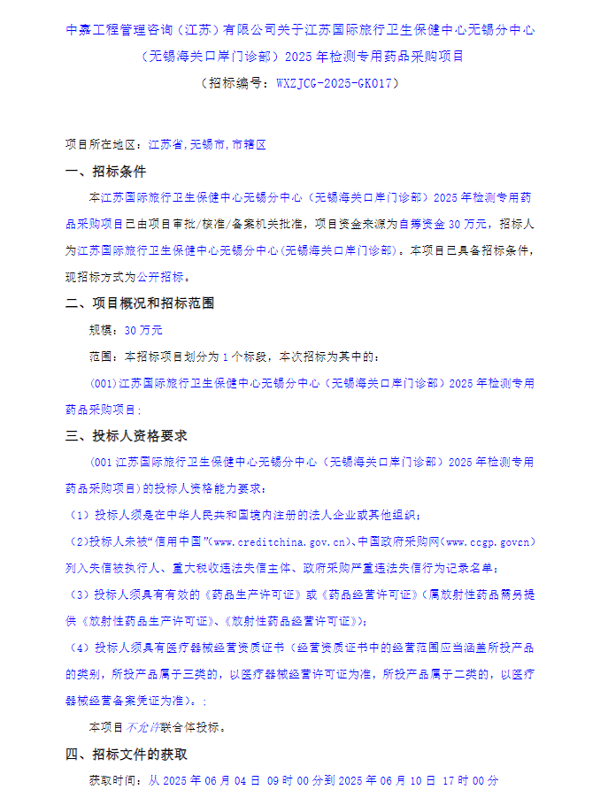 【江苏国际旅行卫生保健中心】中嘉工程管理咨询(江苏)有限公司关于江苏国际旅行卫生保健中心无锡分中心(无锡海关口岸门诊部)2025年检测专用药品采购项目