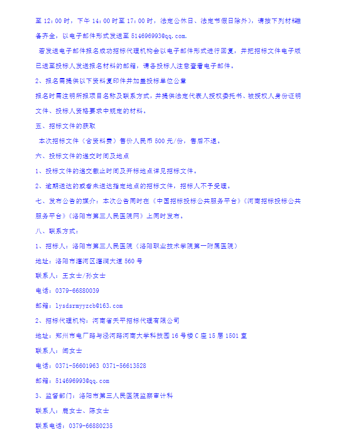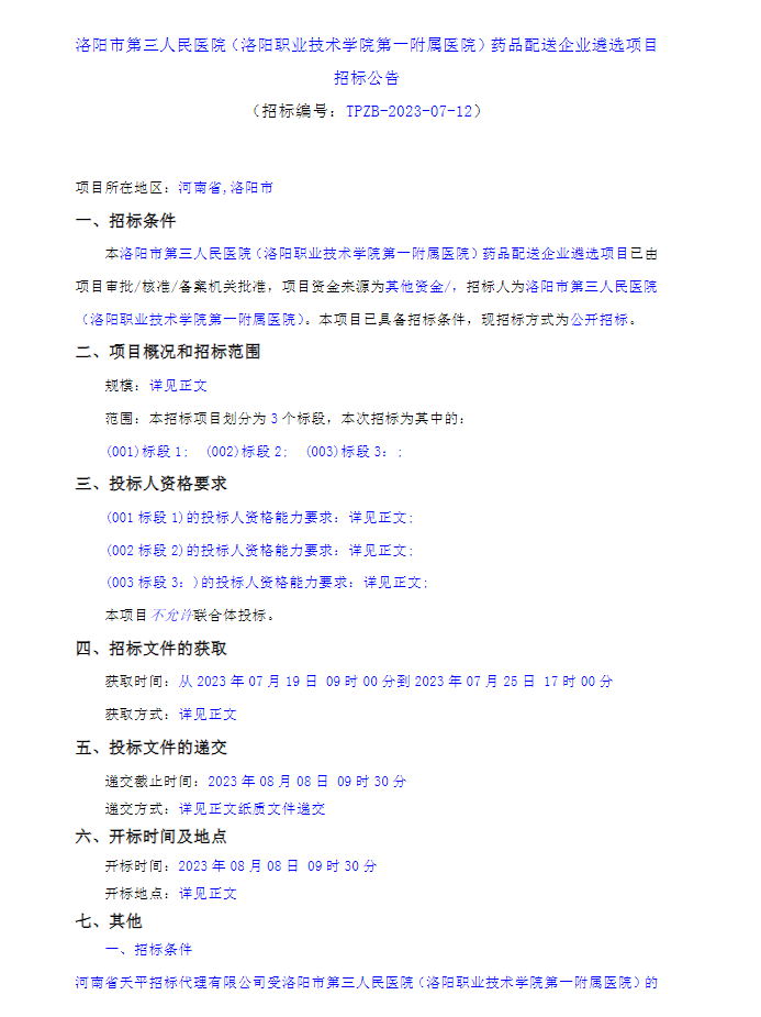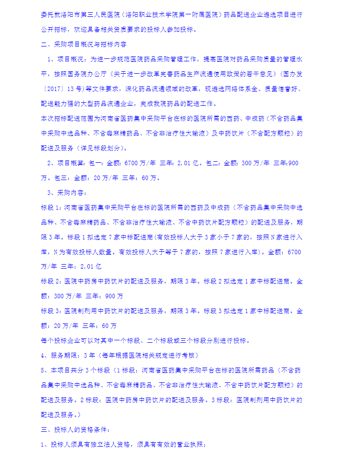 【洛阳市第三人民医院】河南省洛阳市第三人民医院(洛阳职业技术学院第一附属医院)药品配送企业遴选项目招标公告