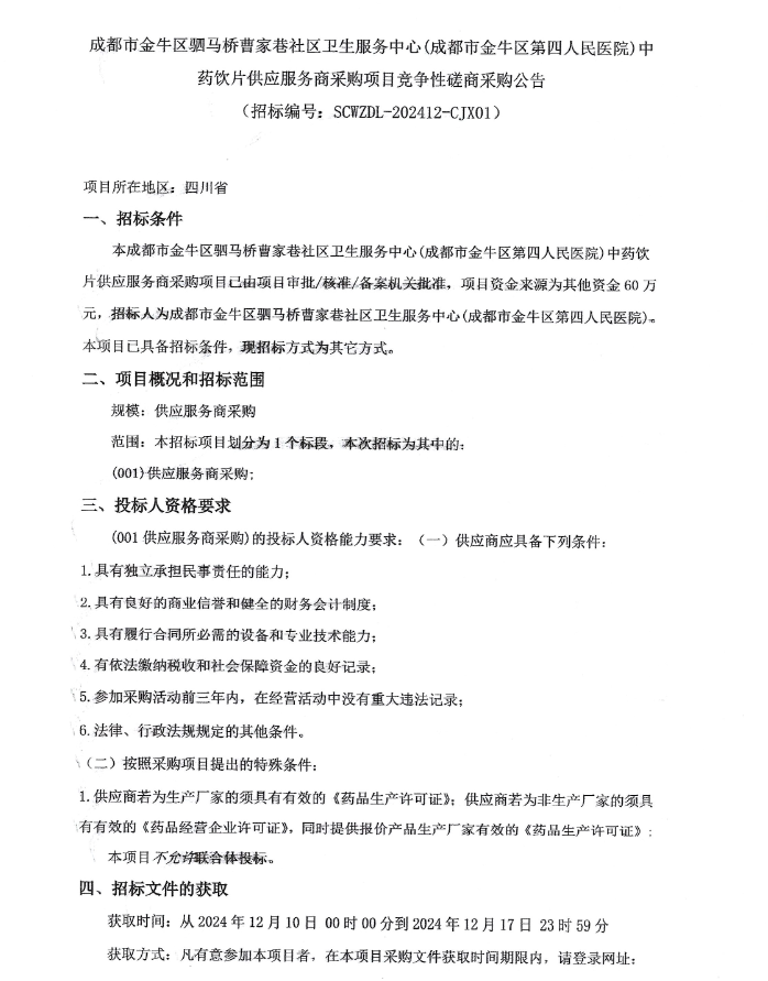 【成都市金牛区驷马桥曹家巷社区卫生服务中心】四川省成都市金牛区驷马桥曹家巷社区卫生服务中心(成都市金牛区第四人民医院)中药饮片供应服务商采购项目竞争性磋商采购公告