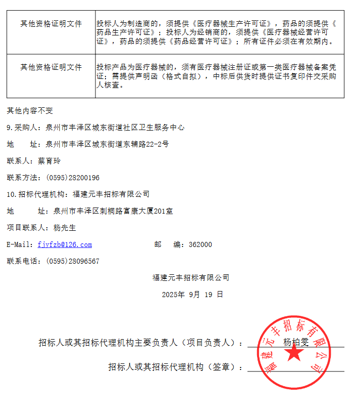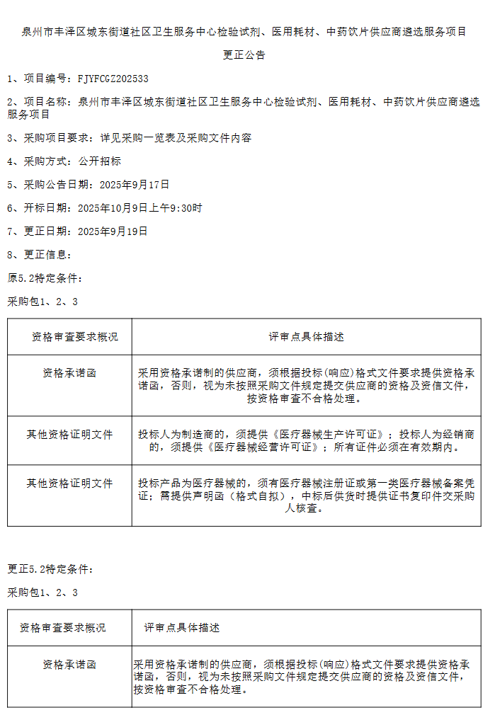 【泉州市丰泽区城东街道社区卫生服务中心】福建省泉州市丰泽区城东街道社区卫生服务中心检验试剂、医用耗材、中药饮片供应商遴选服务项目更正公告