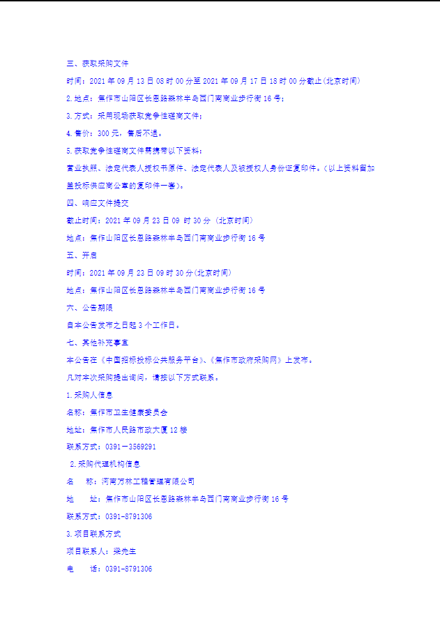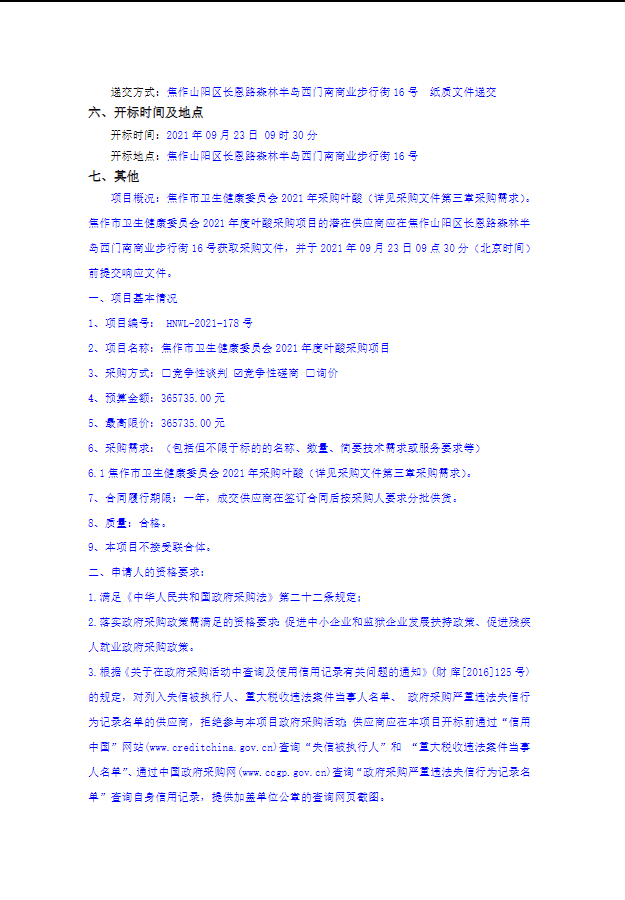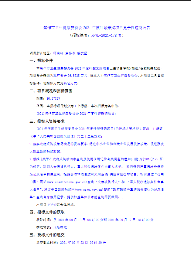 焦作市卫生健康委员会2021年度叶酸采购项目竞争性磋商公告