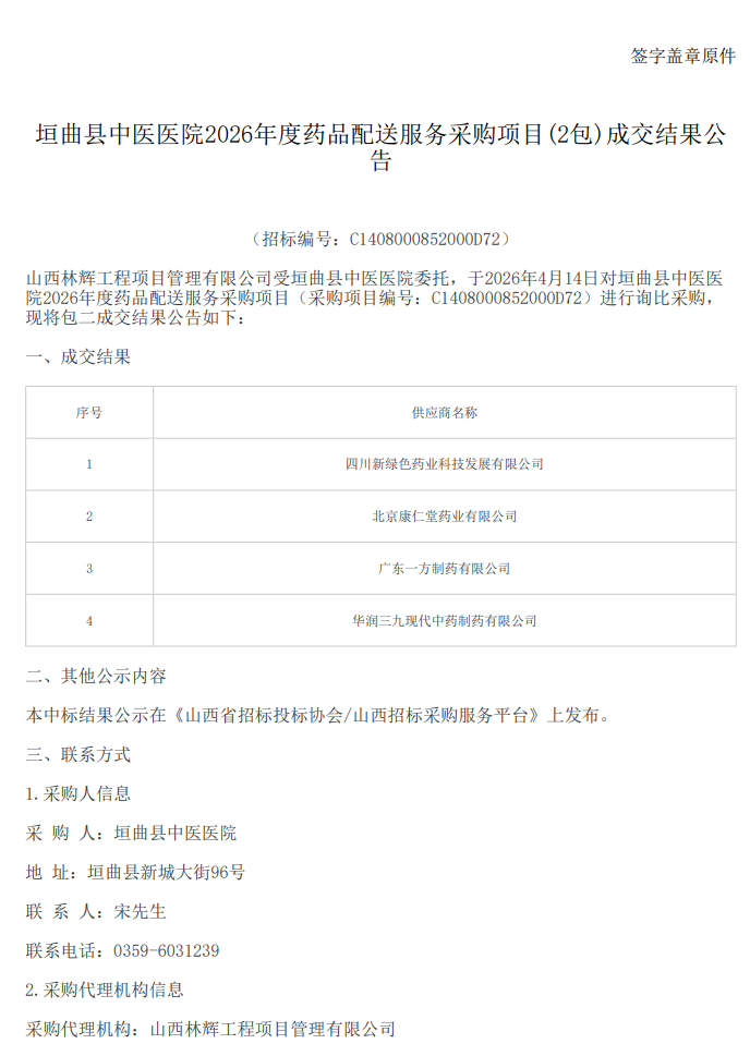【运城市垣曲县中医医院】山西省垣曲县中医医院2026年度药品配送服务采购项目(2包)成交结果公告