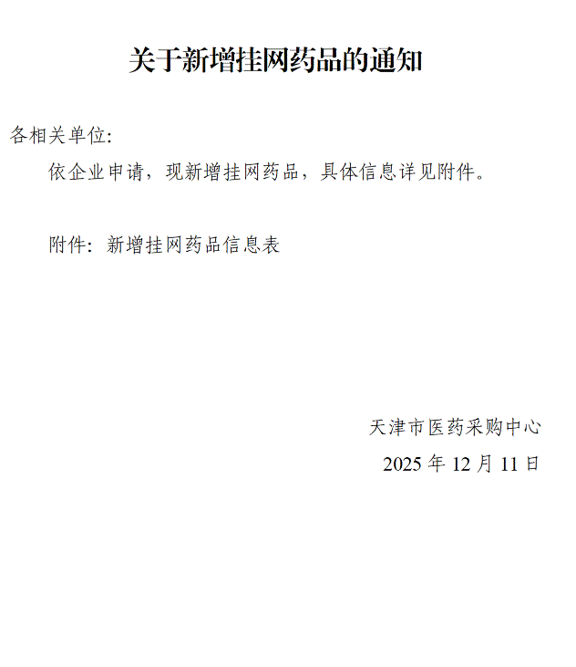 【天津】天津市关于新增挂网药品的通知(20251211)