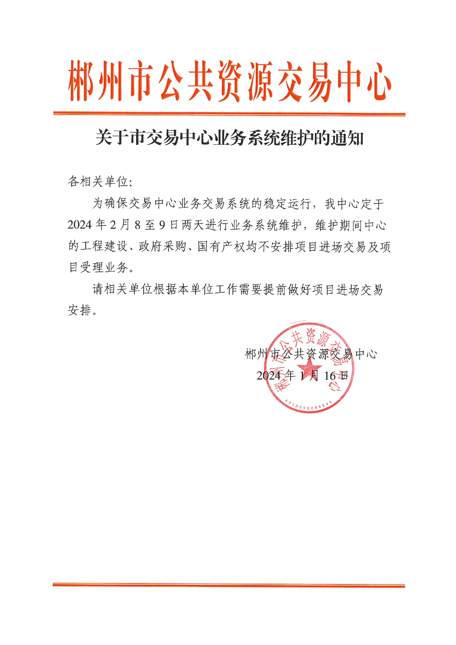 【郴州】关于市公共资源交易中心业务系统维护的通知