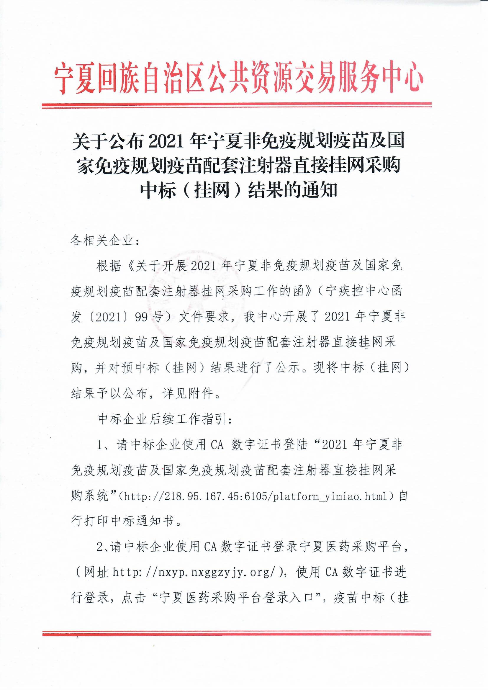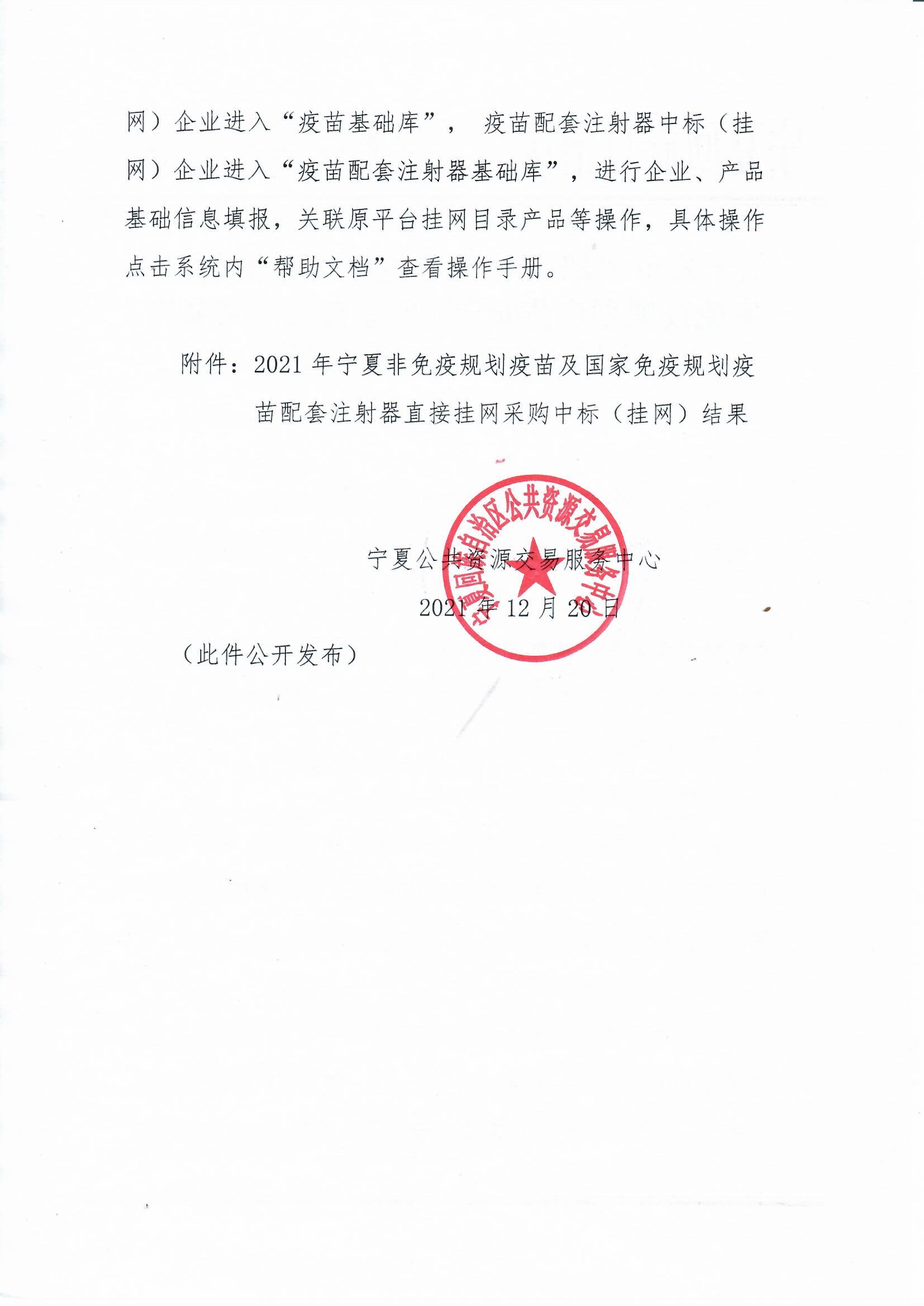 【宁夏】关于公布2021年宁夏非免疫规划疫苗及国家免疫规划疫苗配套注射器直接挂网采购中标(挂网)结果的通知