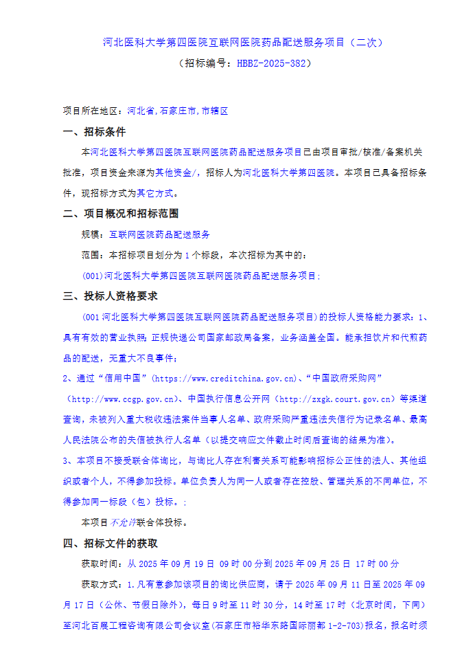 【河北医科大学第四医院】河北医科大学第四医院互联网医院药品配送服务项目(二次)