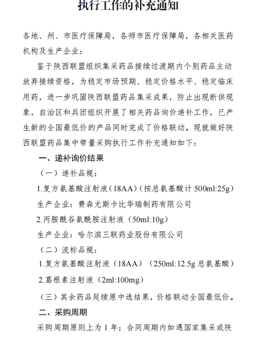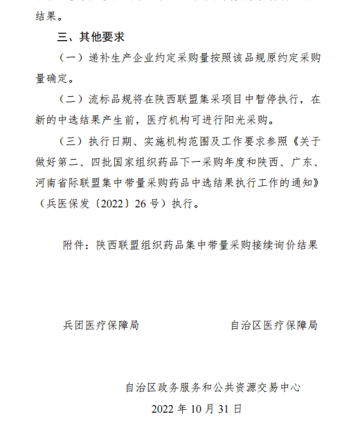 【新疆】新疆维吾尔自治区关于做好陕西联盟集采药品接续执行工作的补充通知