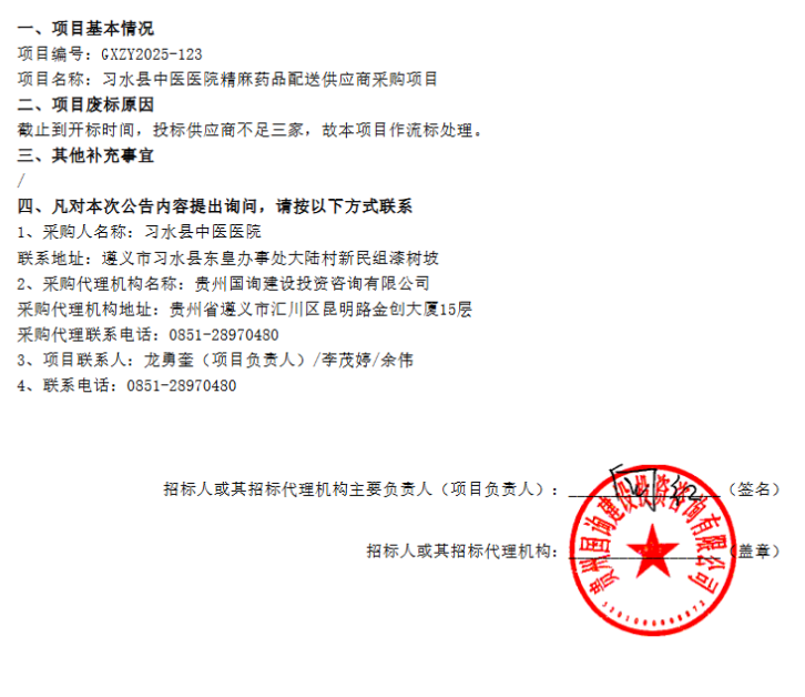 【遵义市习水县中医医院】贵州省遵义市习水县中医医院精麻药品配送供应商采购项目流标公告