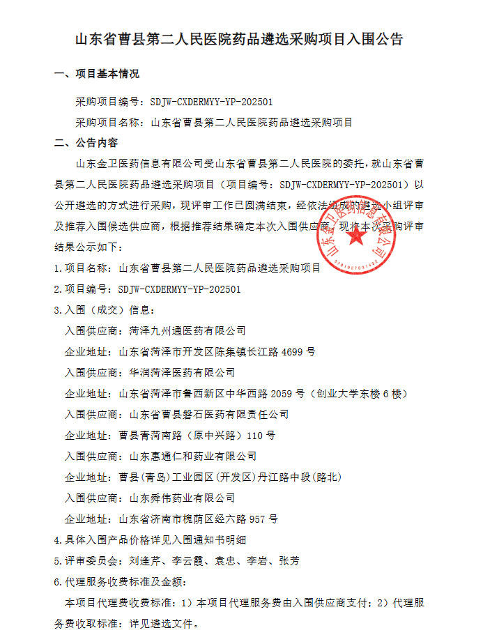 【菏泽市曹县第二人民医院】山东省曹县第二人民医院药品遴选采购项目入围公告