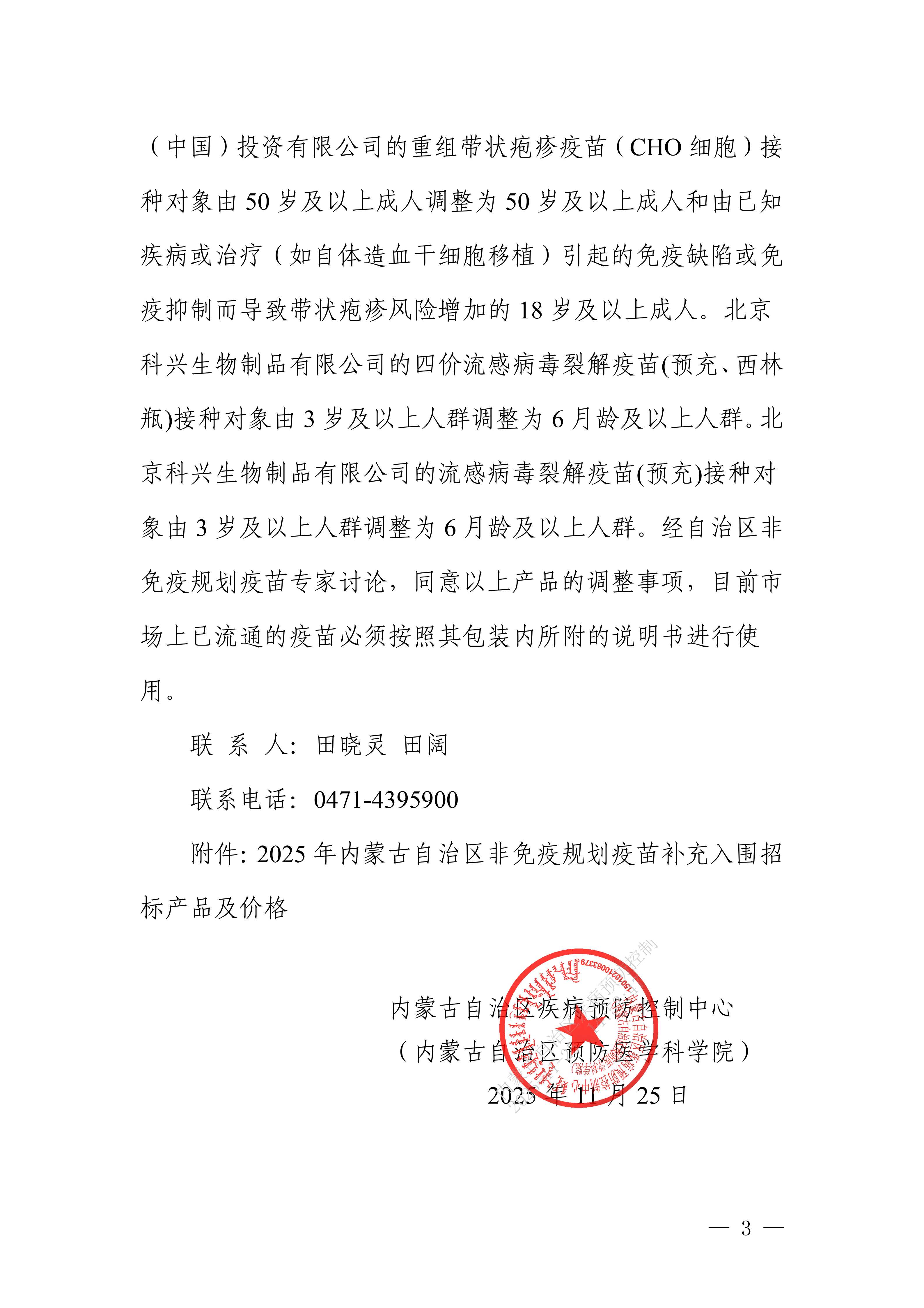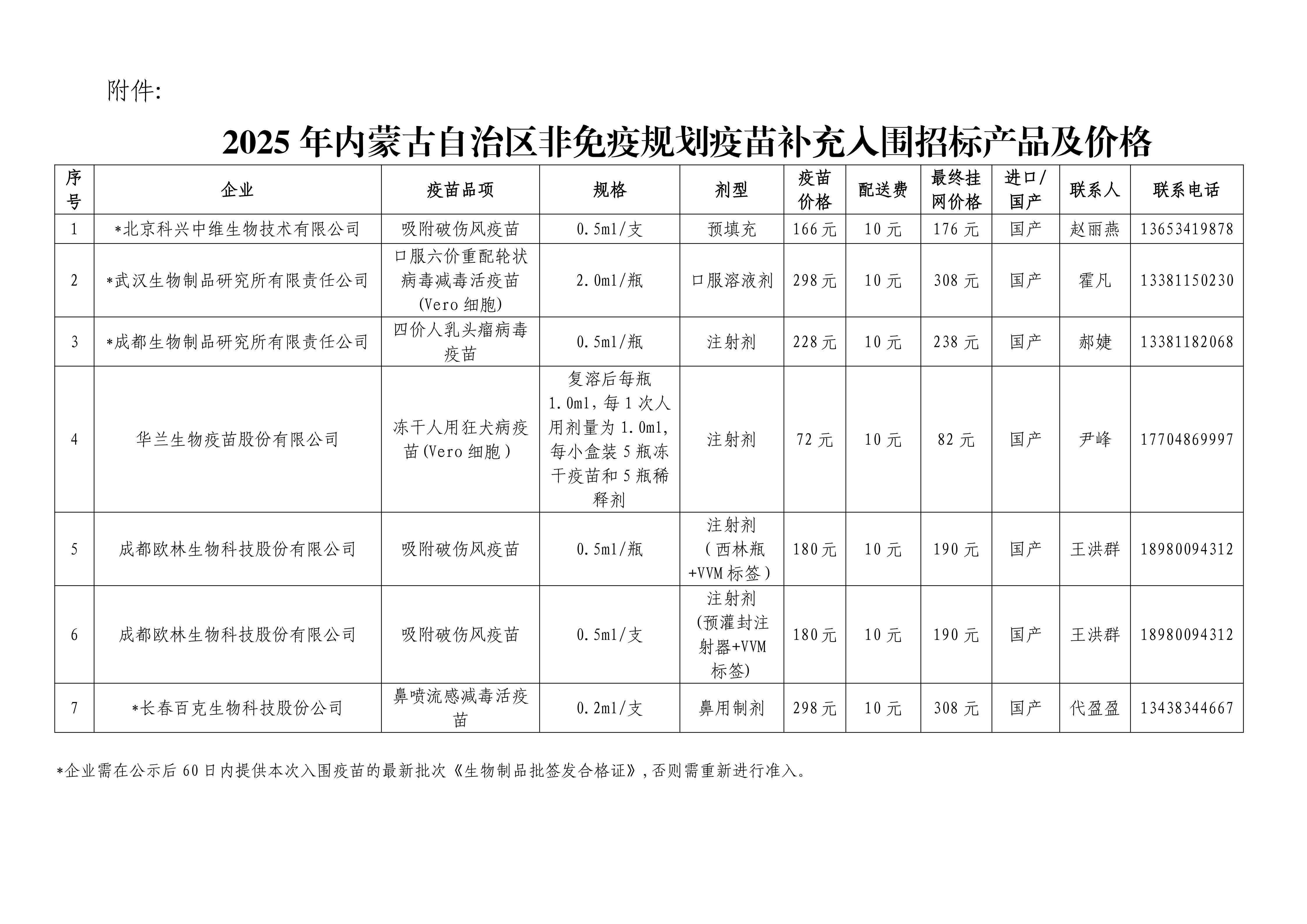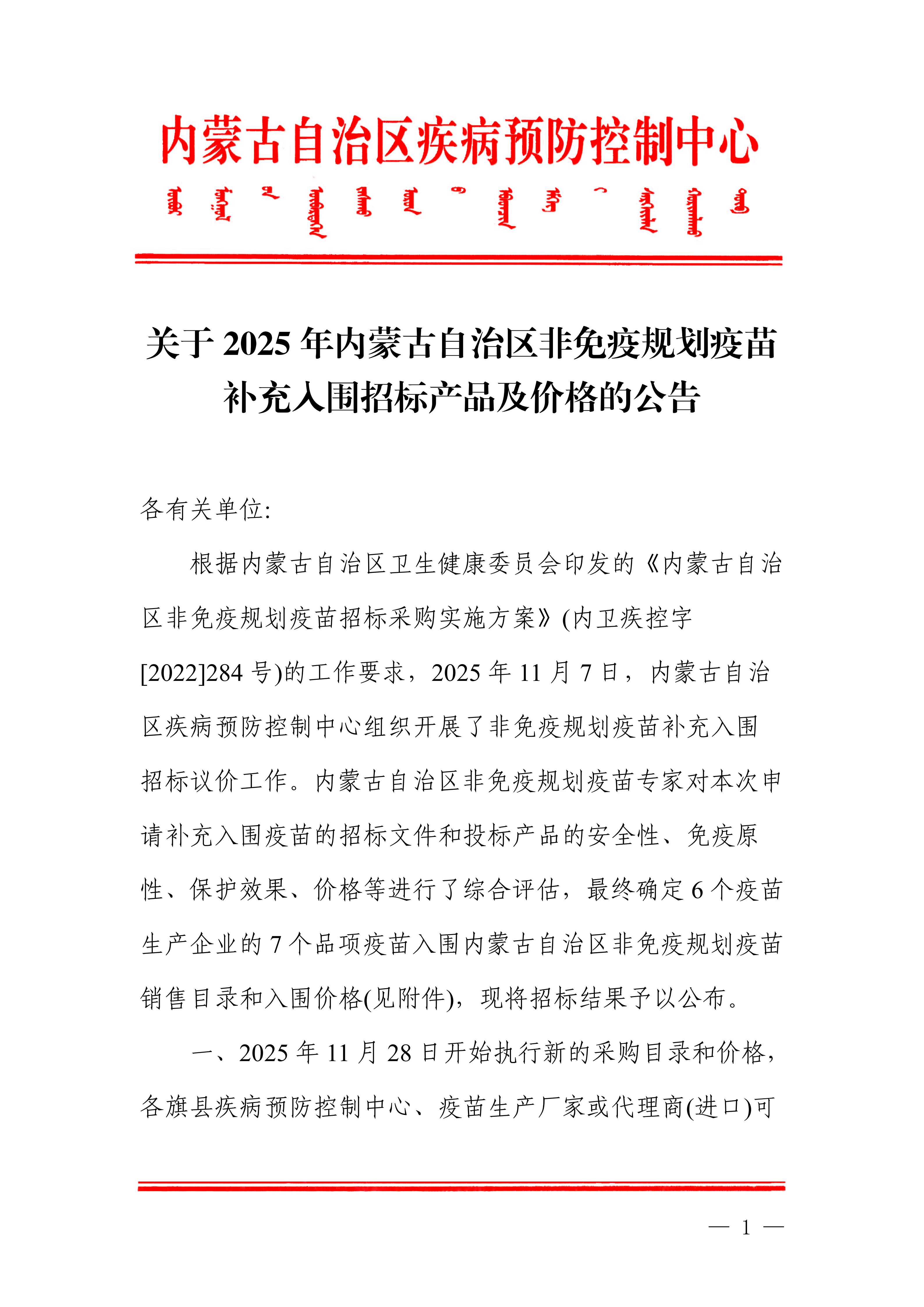 【内蒙】关于2025年内蒙古自治区非免疫规划疫苗补充入围招标产品及价格的公告