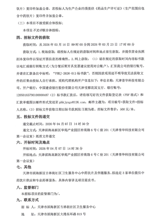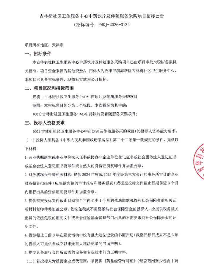 【天津市古林街社区卫生服务中心】天津市古林街社区卫生服务中心中药饮片及伴随服务采购项目招标公告