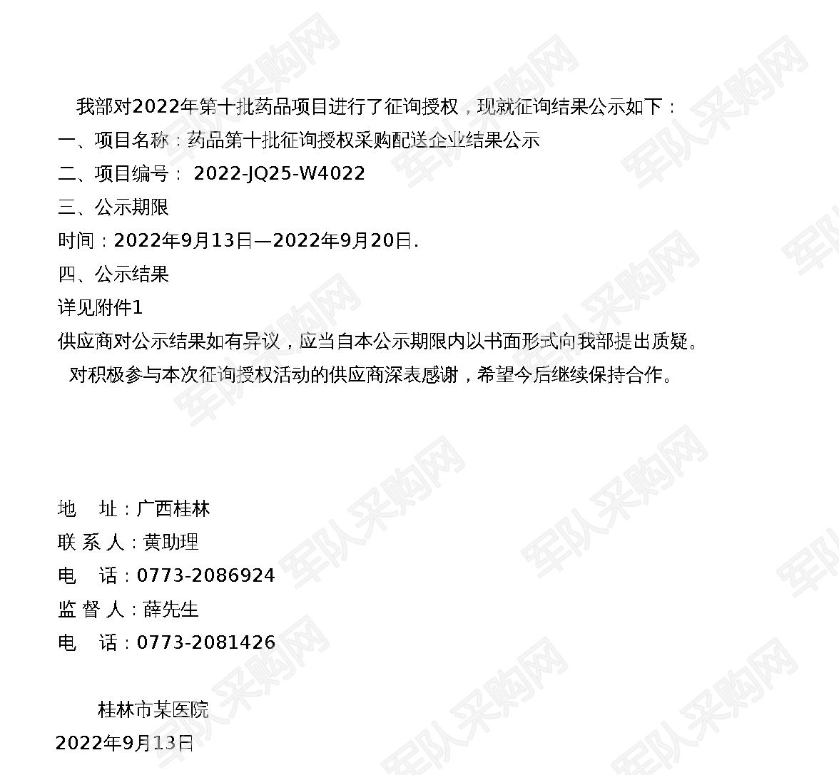 【军队采购网】2022年第十批药品征询授权采购公示(2022-JQ25-W4022)