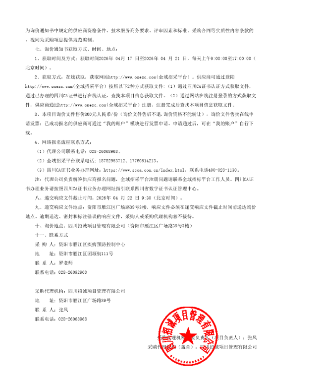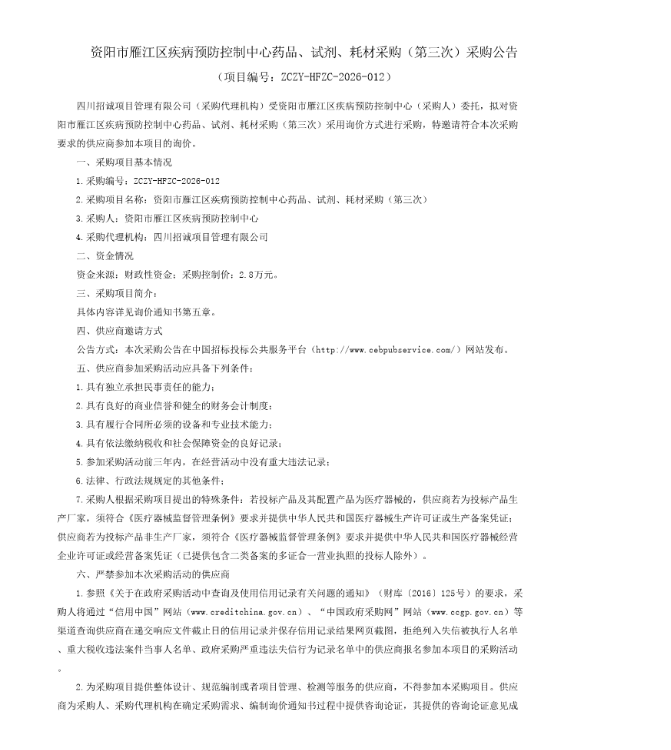 【资阳市雁江区疾病预防控制中心】四川省资阳市雁江区疾病预防控制中心药品、试剂、耗材采购(第三次)采购公告