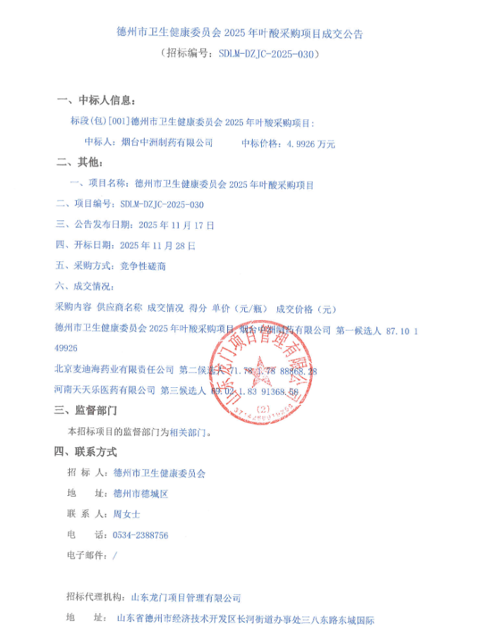 【德州市卫生健康委员会】山东省德州市卫生健康委员会2025年叶酸采购项目成交公告