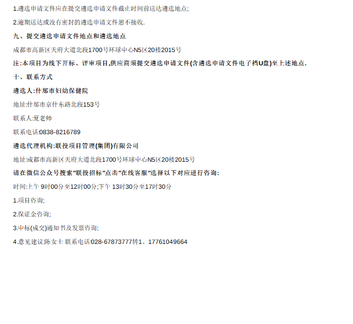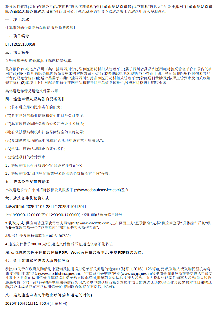 【德阳市什邡市妇幼保健院】四川省什邡市妇幼保健院药品配送服务商遴选项目竞争性磋商采购公告