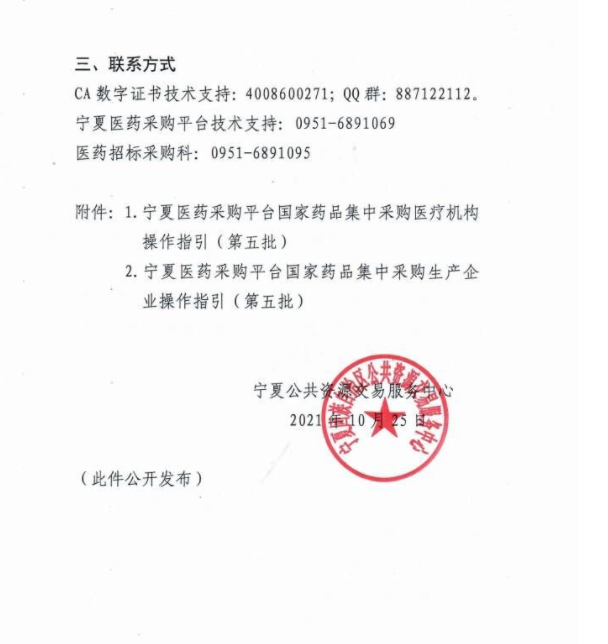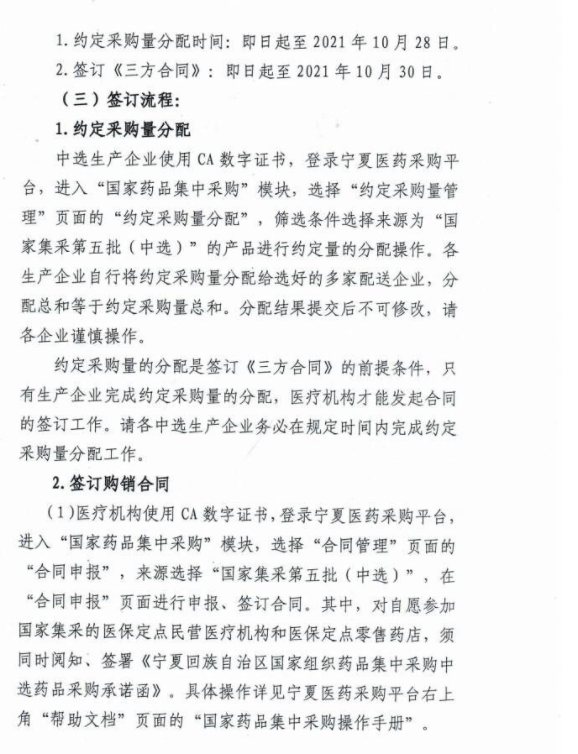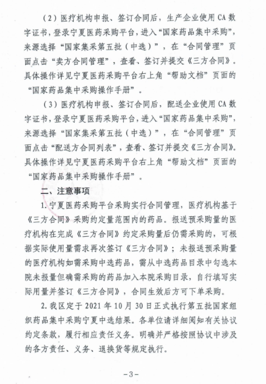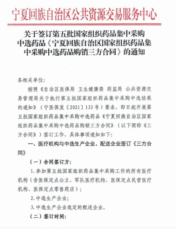 【宁夏】2021年宁夏自治区关于签订第五批国家组织药品集中采购中选药品《宁夏回族自治区国家组织药品集中采购中选药品购销三方合同》的通知