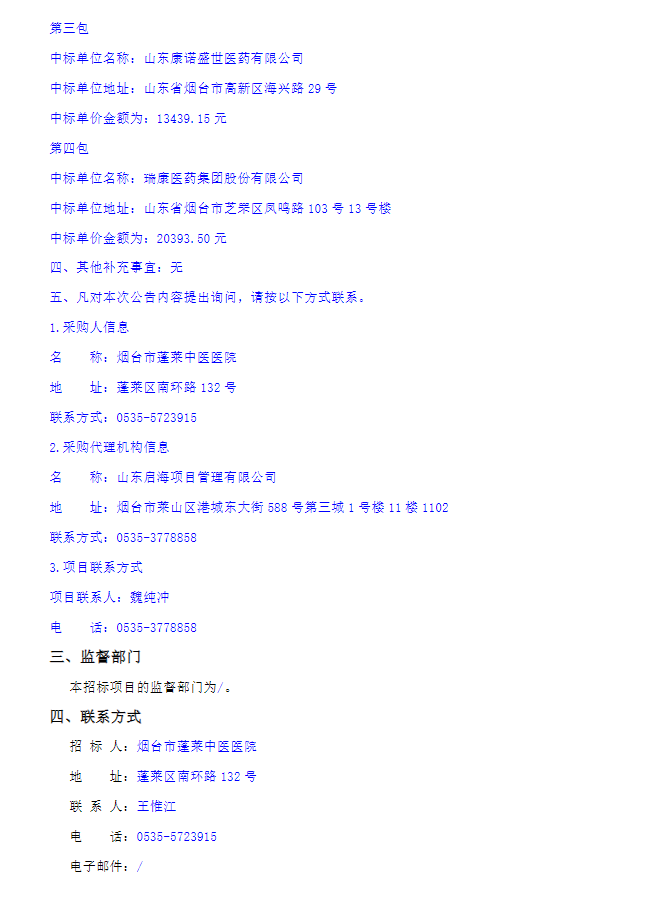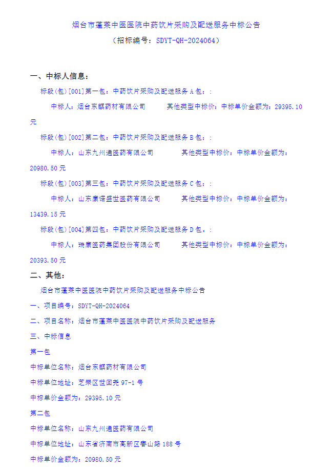 【烟台市蓬莱中医医院】山东省烟台市蓬莱中医医院中药饮片采购及配送服务中标公告