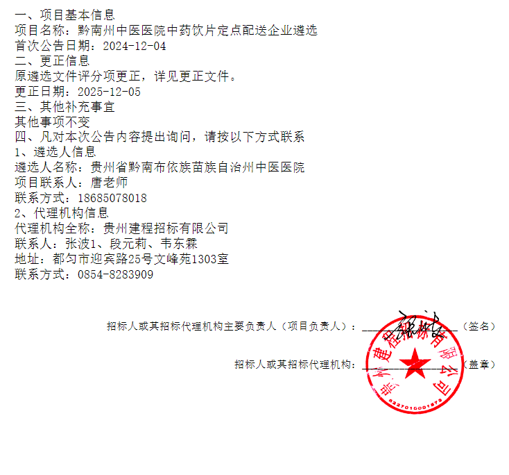 【黔南布依族苗族自治州中医医院】贵州省黔南州中医医院中药饮片定点配送企业遴选更正公告