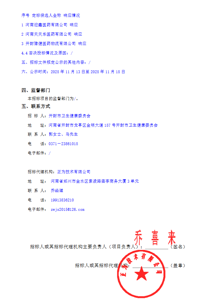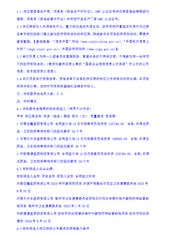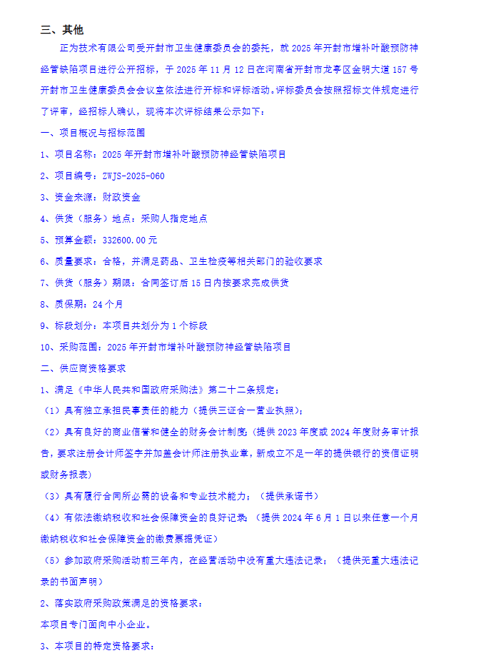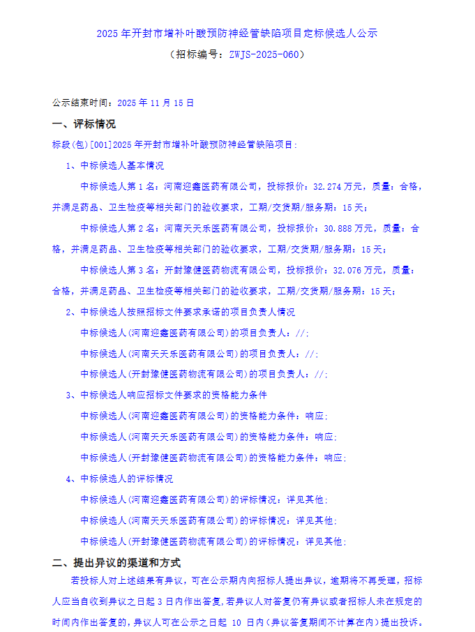 【开封市卫生健康委员会】河南省2025年开封市增补叶酸预防神经管缺陷项目定标候选人公示
