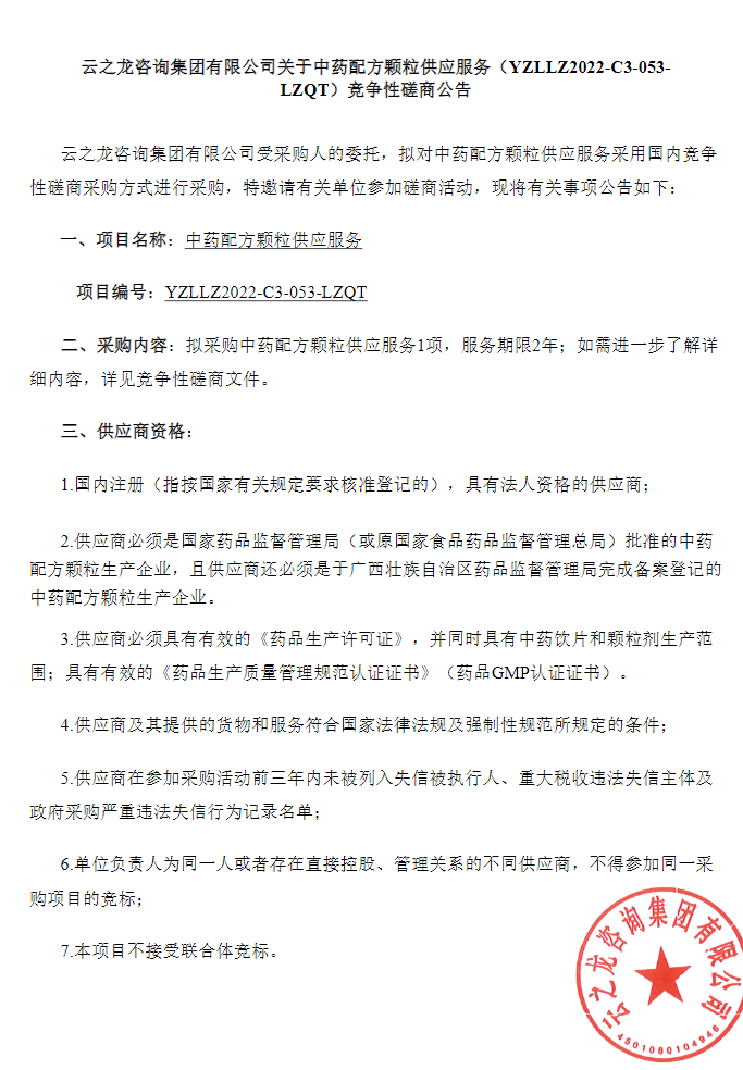 【广西科技大学第二附属医院】广西壮族自治区柳州市鱼峰区云之龙咨询集团有限公司关于中药配方颗粒供应服务(YZLLZ2022-C3-053-LZQT)竞争性磋商公告