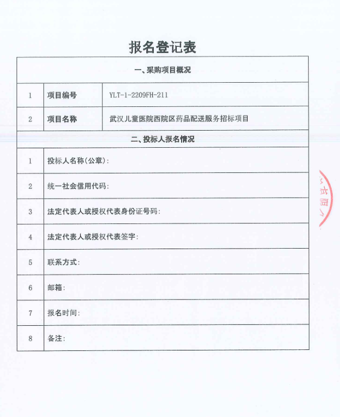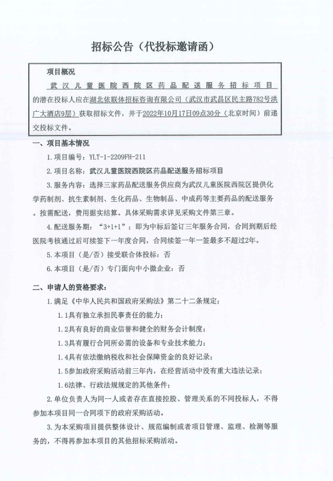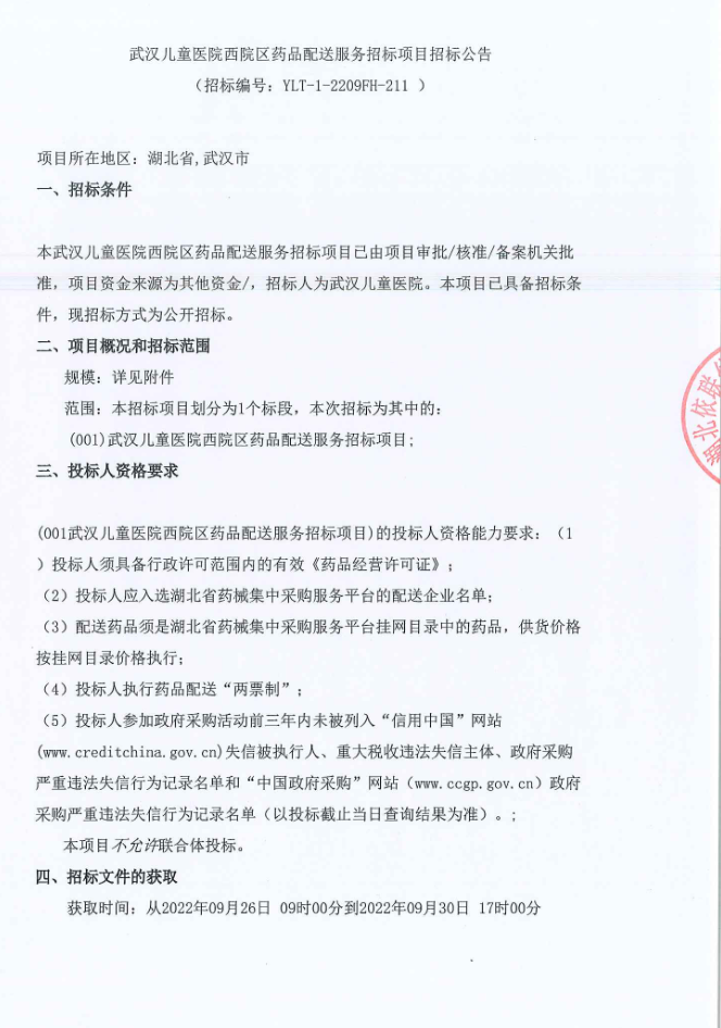 【湖北省武汉儿童医院】西院区药品配送服务招标项目招标公告