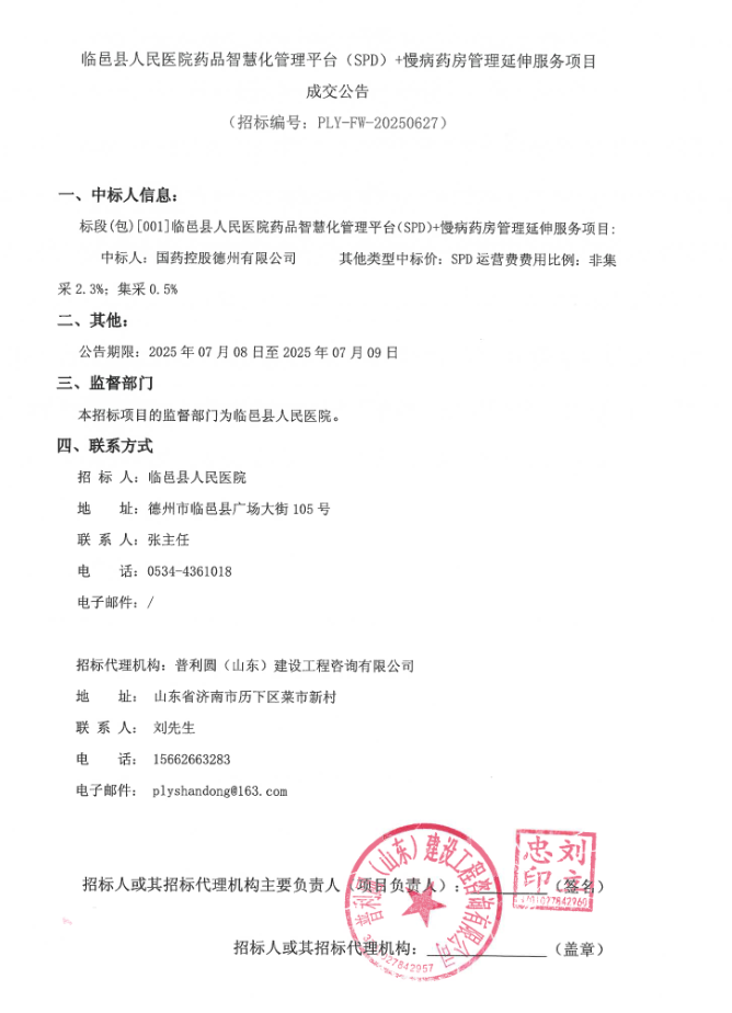 【德州市临邑县人民医院】山东省德州市临邑县人民医院药品智慧化管理平台(SPD)+慢病药房管理延伸服务项目成交公告