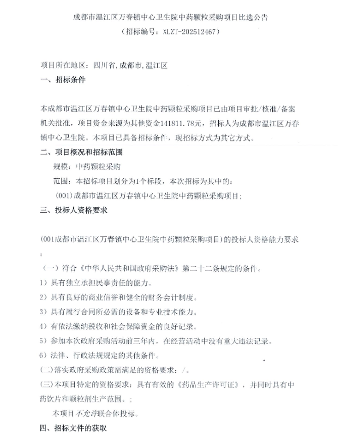 【成都市温江区万春镇中心卫生院】四川省成都市温江区万春镇中心卫生院中药颗粒采购项目比选公告