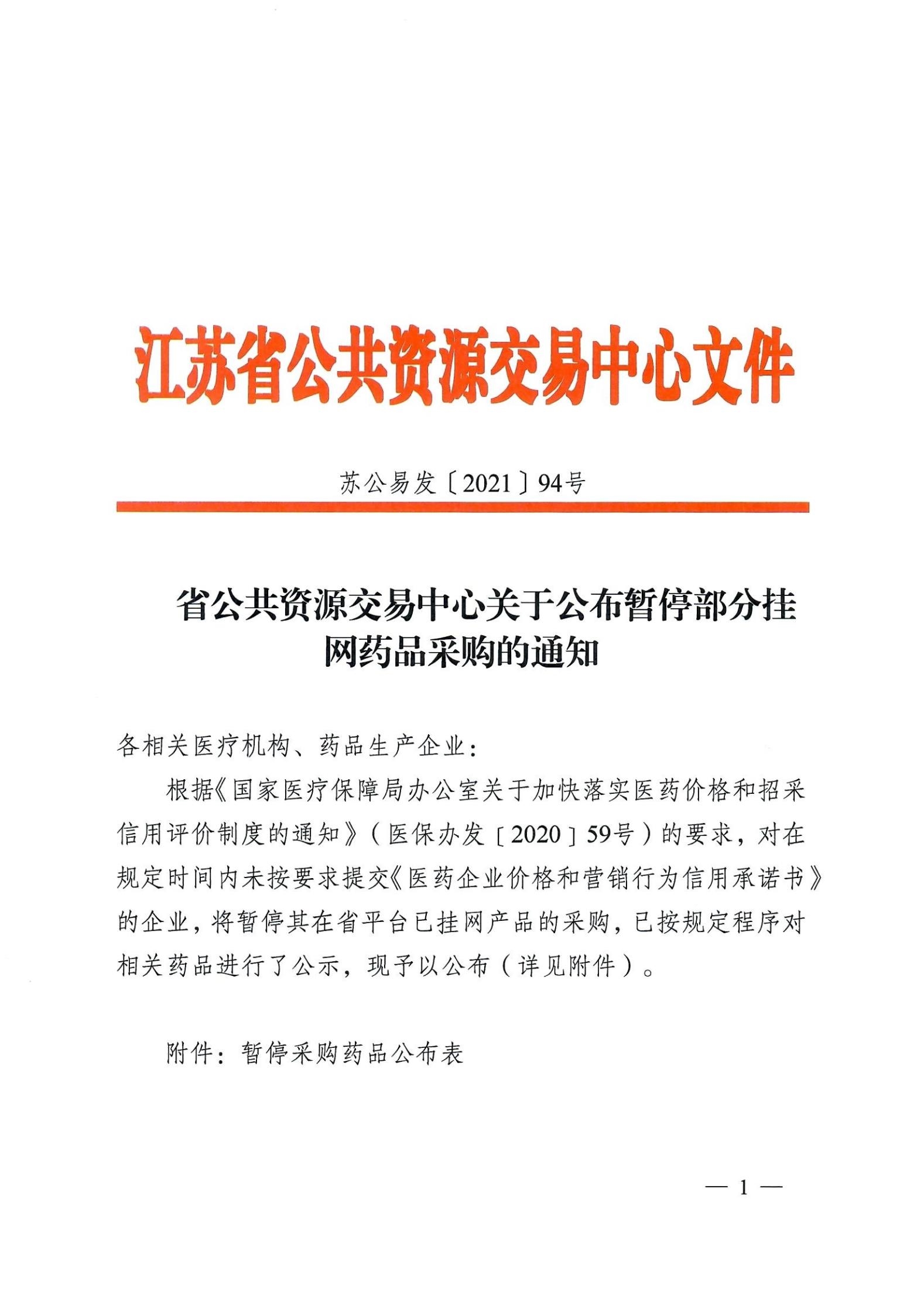 【江苏】2021年江苏省公共资源交易中心关于公布暂停部分挂网药品采购的通知 苏公易发[2021]94号