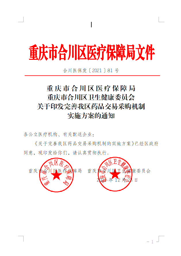 【合川】重庆市合川区关于印发完善我区药品交易采购机制实施方案的通知