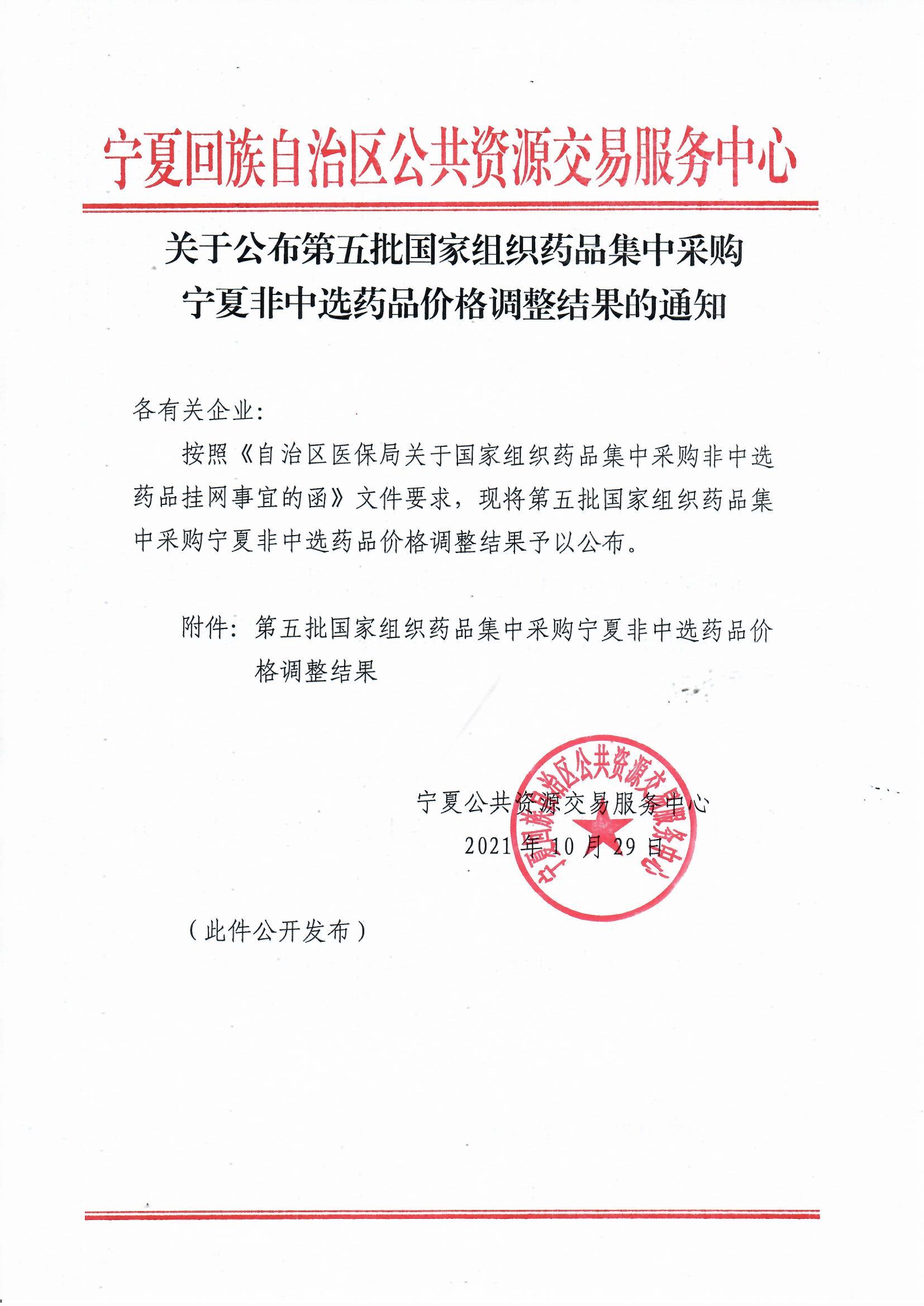 【宁夏】2021年宁夏自治区关于公布第五批国家组织药品集中采购宁夏非中选药品价格调整结果的通知