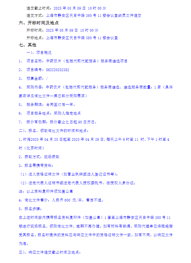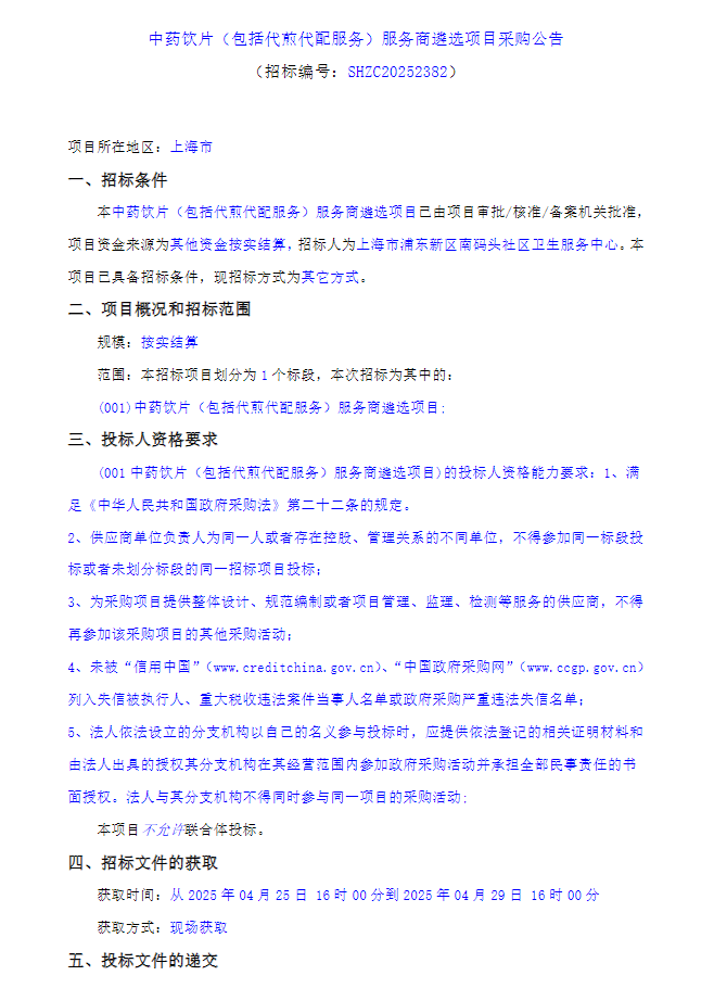【上海市浦东新区南码头社区卫生服务中心】上海市浦东新区南码头社区卫生服务中心中药饮片(包括代煎代配服务)服务商遴选项目采购公告