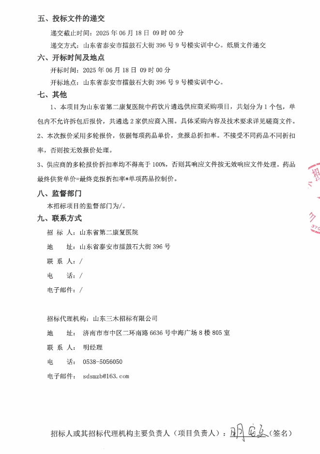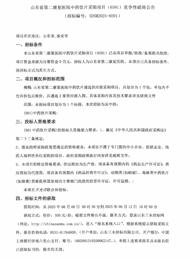 【山东省第二康复医院】山东省第二康复医院中药饮片采购项目(6591)竞争性磋商公告