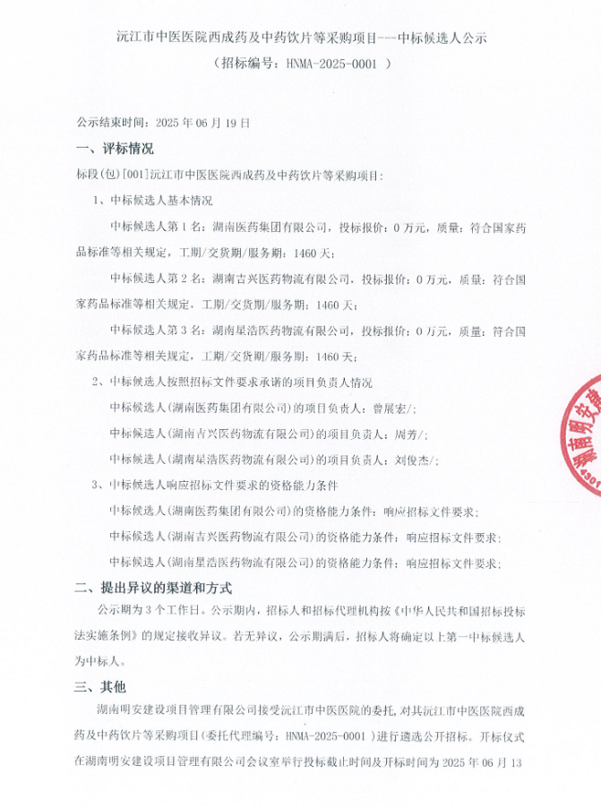 【益阳市沅江市中医医院】湖南省益阳市沅江市中医医院西成药及中药饮片等采购项目---中标候选人公示