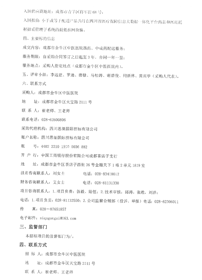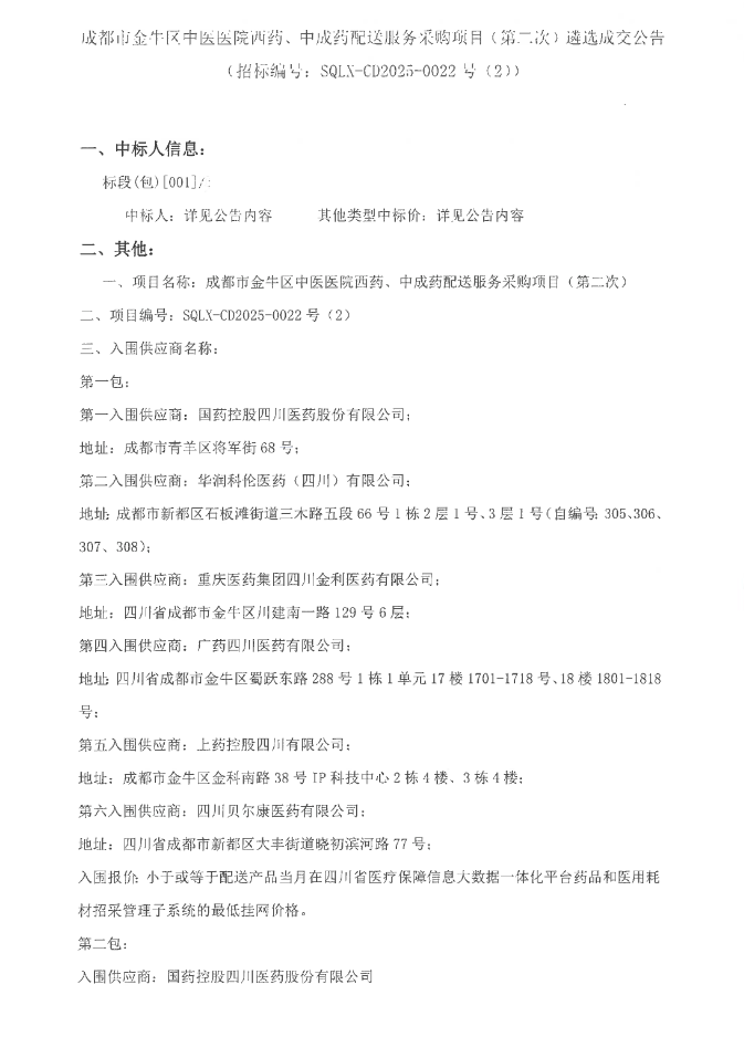 【成都市金牛区中医医院】四川省成都市金牛区中医医院西药、中成药配送服务采购项目(第二次)遴选成交公告