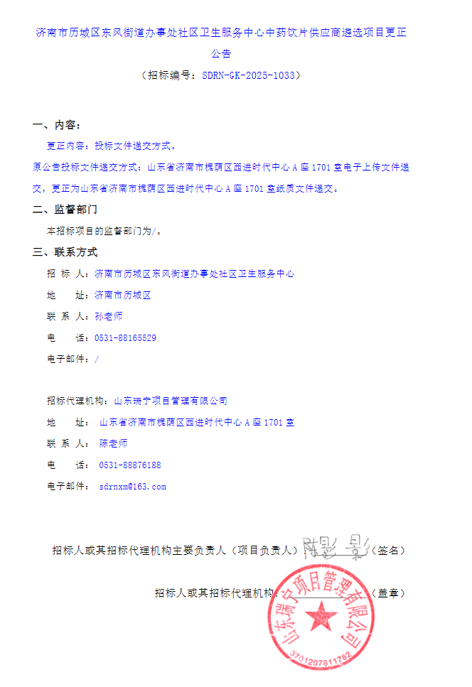 【济南市历城区东风街道办事处社区卫生服务中心】山东省济南市历城区东风街道办事处社区卫生服务中心中药饮片供应商遴选项目更正公告