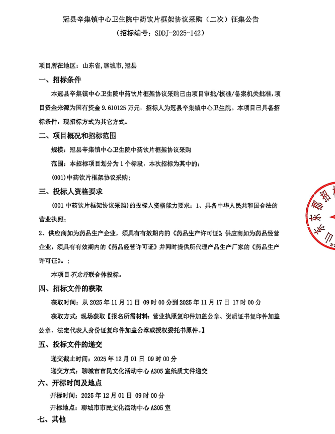 【聊城市冠县辛集镇中心卫生院】山东省聊城市冠县辛集镇中心卫生院中药饮片框架协议采购(二次)征集公告