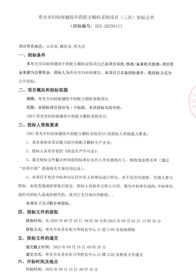 【潍坊市寿光市妇幼保健院】山东省寿光市妇幼保健院中药配方颗粒采购项目(三次)招标公告