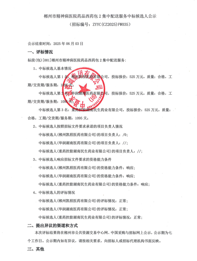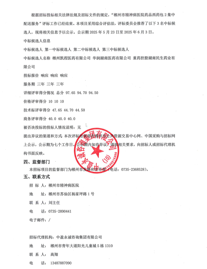 【郴州市精神病医院】湖南省郴州市精神病医院药品西药包2集中配送服务中标候选人公示