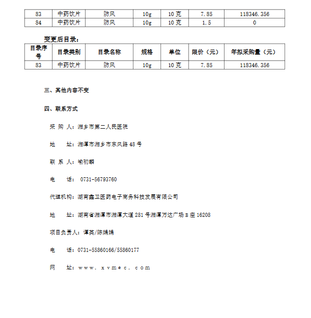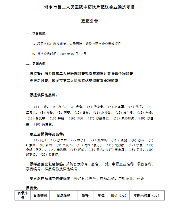 【湘潭市湘乡市第二人民医院】湖南省湘乡市第二人民医院中药饮片配送企业遴选项目更正公告