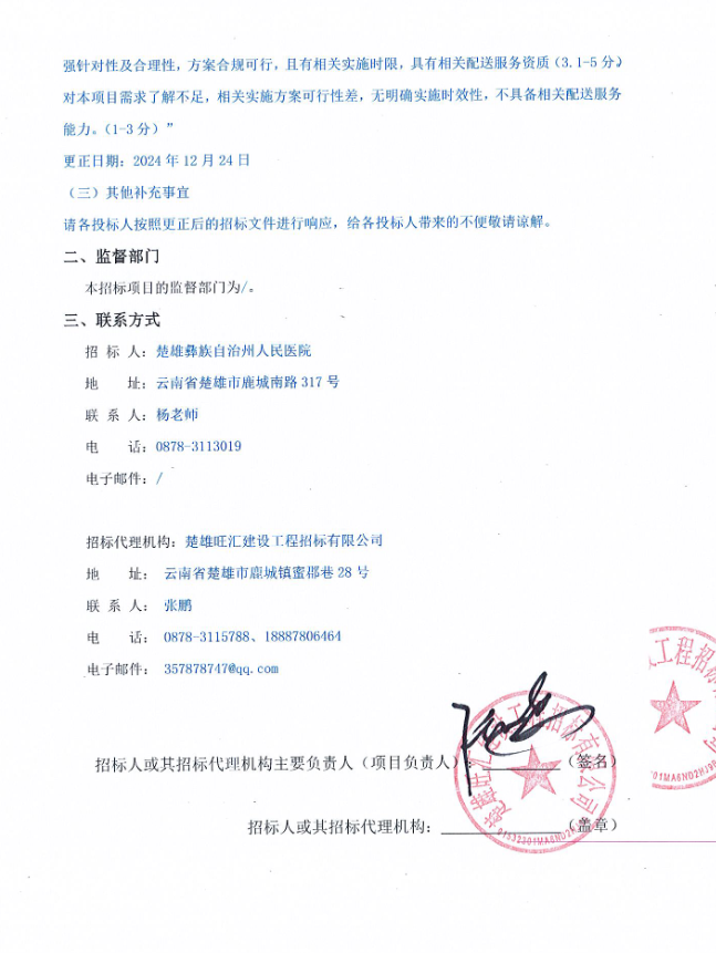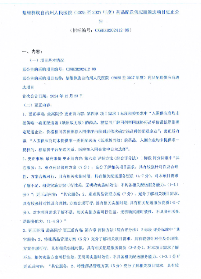 【楚雄彝族自治州人民医院】云南省楚雄彝族自治州人民医院(2025至2027年度)药品配送供应商遴选项目更正公告