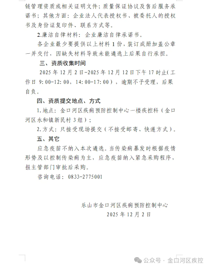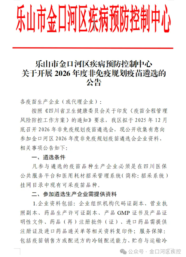 【乐山】金口河区疾病预防控制中心关于开展2026年度非免疫规划疫苗遴选的公告