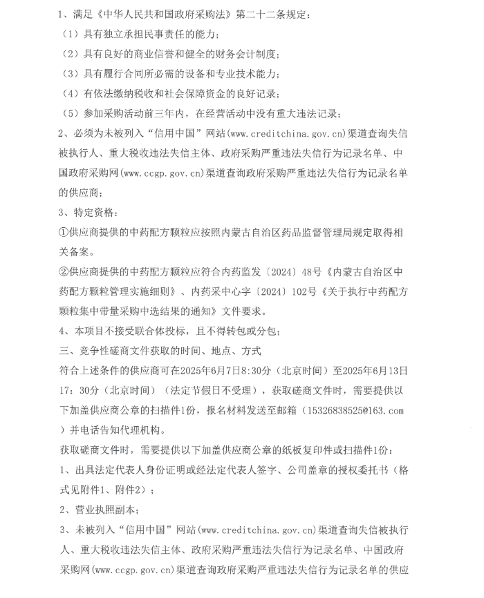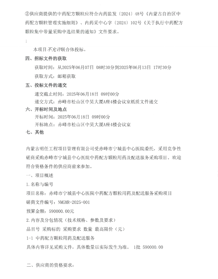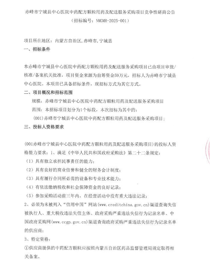 【赤峰市宁城县中心医院】内蒙古自治区赤峰市宁城县中心医院中药配方颗粒用药及配送服务采购项目竞争性磋商公告