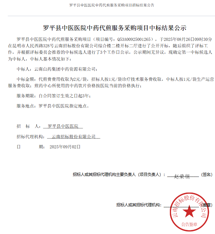 【曲靖市罗平县中医医院】云南省曲靖市罗平县中医医院中药代煎服务采购项目招标结果公告