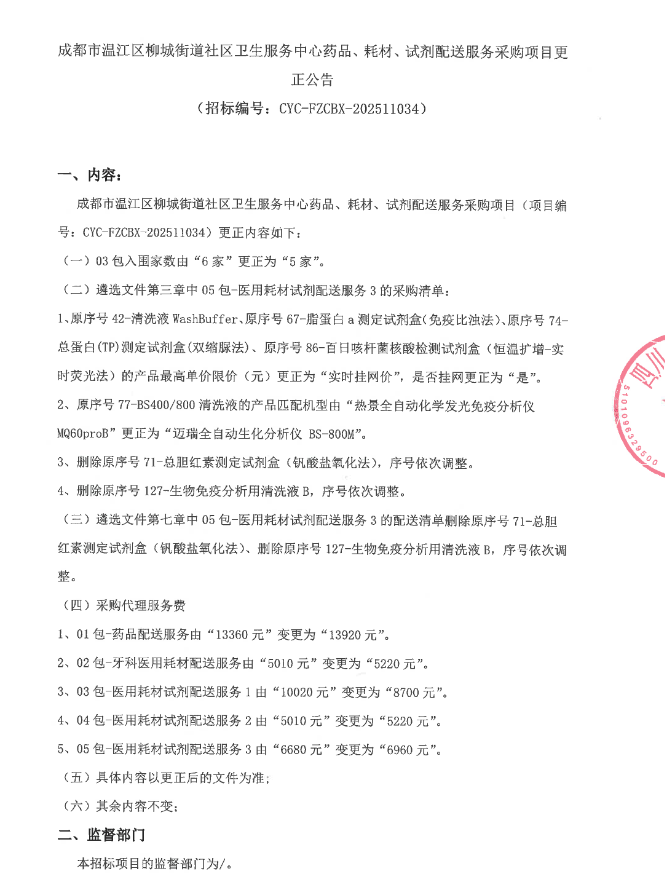 【成都市温江区柳城街道社区卫生服务中心】四川省成都市温江区柳城街道社区卫生服务中心药品、耗材、试剂配送服务采购项目更正公告