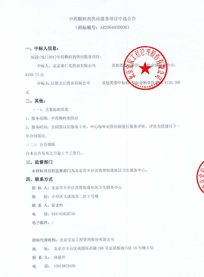 【北京市丰台区青塔街道社区卫生服务中心】北京市丰台区青塔街道社区卫生服务中心中药颗粒剂供应服务项目中选公告