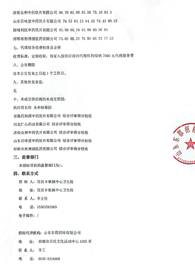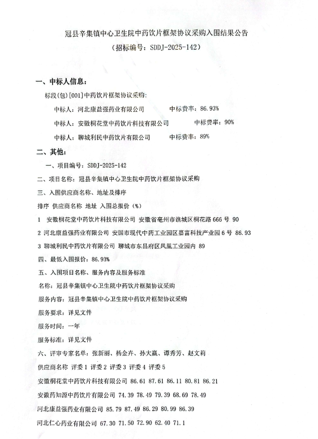 【聊城市冠县辛集镇中心卫生院】山东省聊城市冠县辛集镇中心卫生院中药饮片框架协议采购入围结果公告