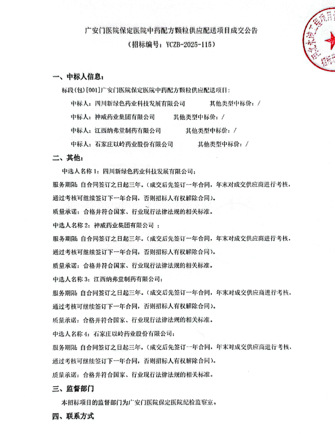 【广安门医院保定医院】河北省广安门医院保定医院中药配方颗粒供应配送项目成交公告